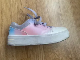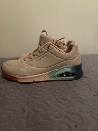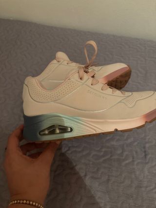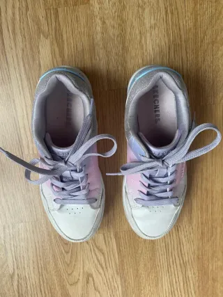 Zapatillas deportivas Skechers con un diseño moderno y llamativo. Con muy poco uso - Combinación de colores degradados en azul y rosa. - Detalle de purpurina en la zona del talón. - Suela gruesa y cómoda.