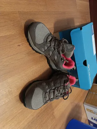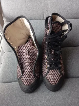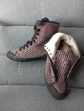 Zapatillas altas de tela con un diseño tejido en rosa y negro. - Estilo botín. - Cierre con cordones. - Suela de goma. Son calentitas, aunque por dentro no llevan forro, el material de fuera las hace calentitas. Las he usado en invierno. Tienen uso y aunque aún tienen mucha vida útil, sí tienen algunos defectos en la parte interior. Por fuera y suela están muy bien cuidadas.