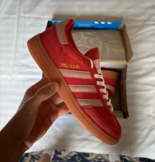 Zapatillas Adidas Spezial en color rojo con detalles en rosa pálido. Un clásico con suela de goma. - Diseño retro. - Tres rayas icónicas de Adidas. - Detalle Spezial bordado.