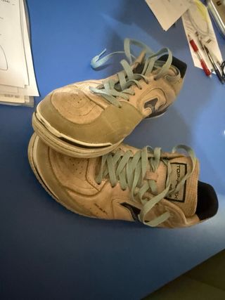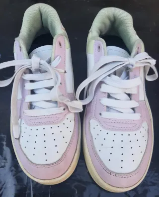 Zapatillas deportivas Nike en color rosa con detalles blancos. - Diseño deportivo. - Cierre con cordones blancos. - Logo de Nike en los laterales y el talón. - Tienen bastante uso pero por fuera están cuidadas y no tienen defectos significativos. El problema es la suela que en los trozos de suela color rosa y beige se han puesto duros y resbalan un poco. Habría que ponerle suela nueva. Yo se la he puesto a varias y funciona muy bien, quedan como nuevas. Pero quiero deshacerme de algunas porque tengo muchas.