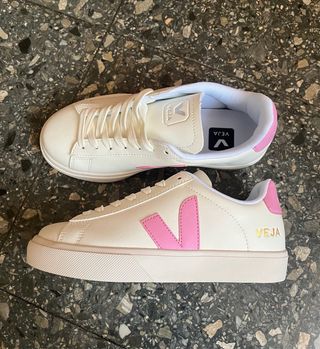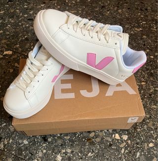 Zapatillas de la marca Veja en color blanco con detalles en rosa.