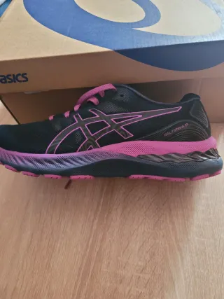 Zapatillas deportivas Asics Gel-Nimbus 23 en color negro con detalles en rosa. - Diseño deportivo. - Marca Asics. - Modelo Gel-Nimbus 23.