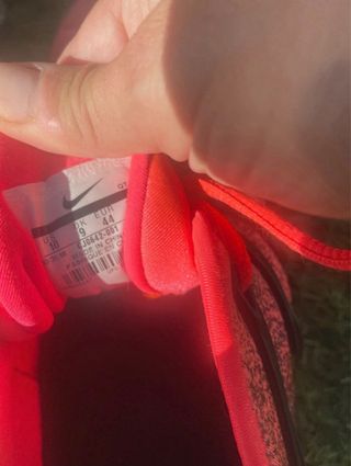 Zapatillas Nike Vapormax Plus en tonos rosa y rojo. Una de las zapatillas tiene la tela más clara que la otra debido a que estuvo expuesta a la luz en la tienda