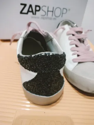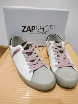 Zapatillas de la marca ZapShop en talla 37. - Combinación de blanco y gris. - Puntera en antelina color beige. - Cordones en tono rosa. - Detalle azul brillante en la parte trasera.