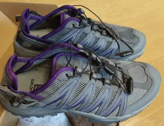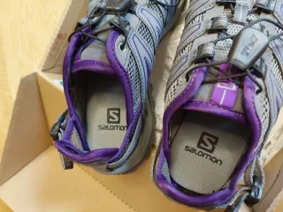 Zapatillas deportivas Salomon en tonos grises y morados. Perfectas para actividades al aire libre. - Diseño de malla transpirable. - Cierre con cordones elásticos. - Detalle de tirador en el talón. - Se han usado una vez.