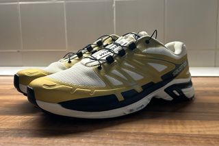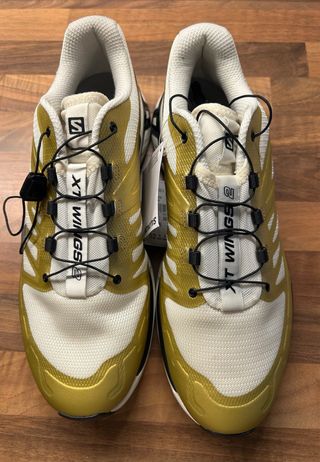 Zapatillas deportivas Salomon XT Wings 2 en tonos dorados y blancos. Diseñadas para ofrecer rendimiento y estilo. - Parte superior de malla transpirable. - Sistema de lazada rápida. - Suela con tecnología Contagrip.