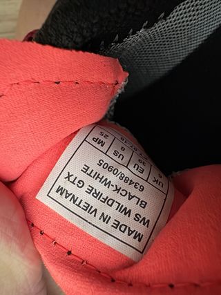 Zapatillas Salomon WS Wildfire GTX en color negro y blanco. Fabricadas en Vietnam. - Modelo: WS Wildfire GTX - Color: Black-White - Talla EU: 39 - Talla US: 8 - Talla MP: 25 - Código: 63488/0905 - Fecha de fabricación: 07-18