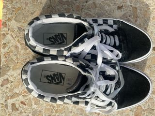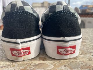 Zapatillas Vans Old Skool cuadros blanco y negro Zapatillas Vans Old Skool originales con el clásico estampado checkerboard en blanco y negro. Diseño icónico con franja lateral blanca y suela waffle de goma característica de la marca. Se han usado muy poco, en buen estado: • Suela con desgaste mínimo • Interior limpio • Sin roturas ni defectos importantes • Cordones originales Ideales para uso diario, skate o looks casuales. Un modelo atemporal que combina con todo.
