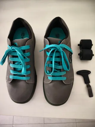 Zapatillas Heelys con ruedas, listas para la acción. - Color gris con cordones y detalles en azul turquesa. - Incluye herramienta para quitar las ruedas.