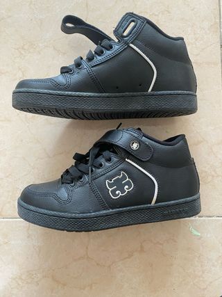 Zapatillas de skateboard. Están en buen estado. Han tenido poco uso. - Son de piel auténtica de ante. - Color verde oliva y negro. Suela marrón. - Ideales para practicar skate o para uso diario como zapatillas de deporte. - Diseño cómodo y resistente.