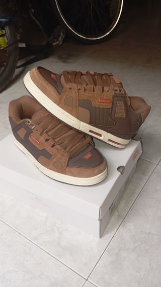 Vendo un par de zapatillas New Balance de skate. Son de color marrón y naranja, y están en muy buen estado. - Ideales para practicar skate. - Diseño cómodo y ligero. - Suela resistente.
