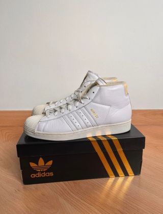 Zapatillas de caña alta Adidas Pro Modelo ADV Sam Narváez en color blanco y detalles dorados. Zapatos para patinar Skate. - Diseño inspirado en el baloncesto. - Parte superior de cuero. - Suela de goma. - Cierre de cordones.
