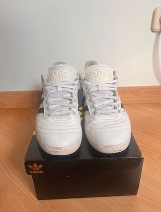 Zapatillas de estilo skater de Adidas. Color negro y beige. - Exterior de ante y cuero. - Suela de goma. - Detalle de las tres rayas. - Logo en la lengüeta. Prácticamente nuevas, usadas muy poco como se puede ver en las fotos. Vendo porque no puedo poner mis plantillas, sin caja original. Precio original 70€.