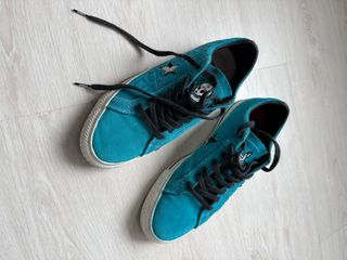 Zapatillas de skate Converse One Star Pro, edición especial Sean Pablo. Diseñadas para el skateboarding con un estilo único. - Color azul/teal vibrante. - Material de ante. - Cordones negros. - Detalle de calavera y estrellas.