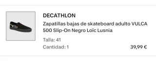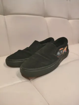 Zapatillas Oxelo de skate tipo Vans de Decathlon negras con un diseño divertido del artista Loïc Lusnia. Muy poco uso, tienen la suela perfecta. - Talla 41 - Estilo slip-on, sin cordones. - Detalle de palmeras y atardecer en el lateral. - Suela negra EN PERFECTAS CONDICIONES. - Material exterior de gamuza, suelas vulcanizadas de caucho.