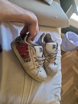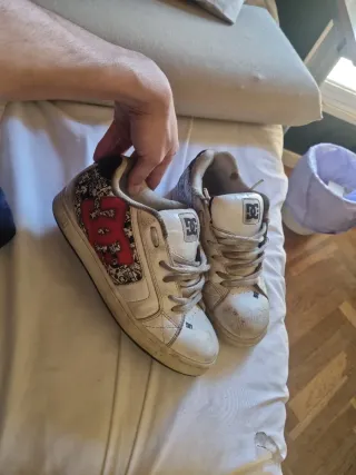 Zapatillas de skate DC Shoes con un diseño llamativo. Sucias pero con un lavado se ponen como nuevas. Un único roto en el interior del zapatos derecho - Combinación de colores blanco y rojo. - Detalle de logo en los laterales.