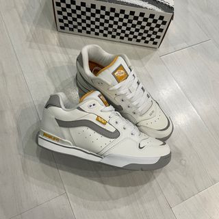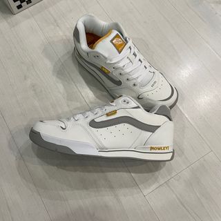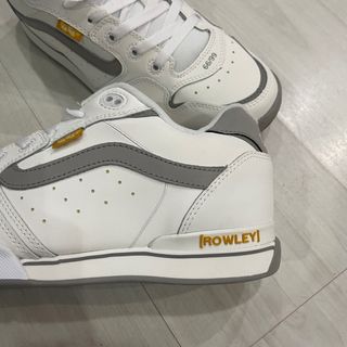 Zapatillas de skate Vans Rowley en talla 44. Combinan blanco y gris con detalles en amarillo. - Diseño inspirado en el skateboarding. - Logo de Vans en la lengüeta y lateral. - Detalle ROWLEY en la suela.
