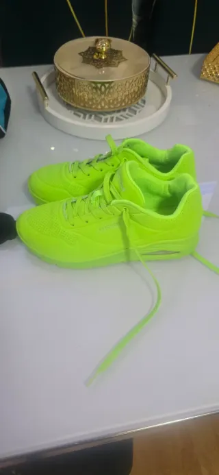 Zapatillas deportivas Skechers en llamativo color verde neón. - Diseño moderno y deportivo. - Cierre con cordones para un ajuste seguro. - Suela con amortiguación visible.