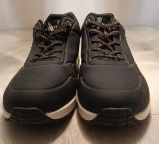 Zapatillas deportivas Skechers en color negro con detalles dorados. Talla 40 (27 cm) Talla 41 (28 cm) - Diseño moderno y cómodo. - Logo de Skechers en el lateral. - Suela blanca con diseño texturizado.