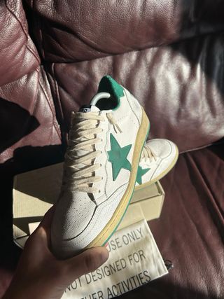 EN: Vintage-style sneakers in a cream color with dark green laces and burgundy detailing on the sides. Made of faux leather and textile, lightweight and stylish for casual looks. Used but in good condition — clean and with intact soles. ES: Zapatillas estilo retro en color crema con cordones verde oscuro y detalles burdeos en los laterales. Hechas de piel sintética y textil, ligeras y con mucho estilo para looks informales. Usadas pero en buen estado — limpias y con suelas en buen estado.