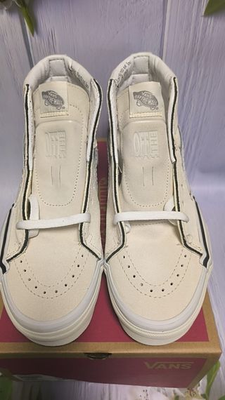 Zapatillas Vans, modelo SK8-HI Reconst, de piel y textil. En color Marshmallow y blanco. Cierre con cordones. Nuevas a estrenar con su caja original. No entrego en mano, solo envios.