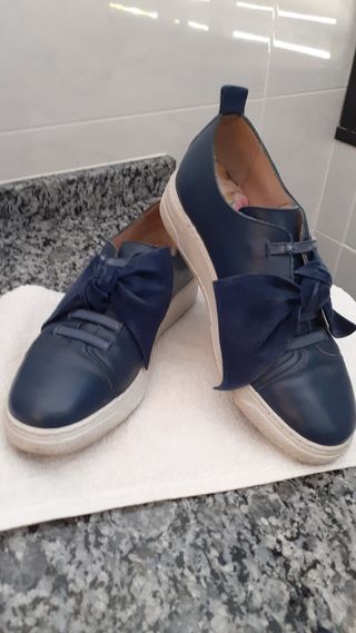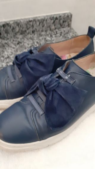 Muy cómodas y bonitas, en piel azul. Original lazo de ante.