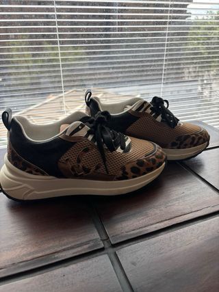 Zapatillas tipo Sneakers de Zara con cuña interior. Combina ante negro, serraje y print animal. Usados pero en muy buen estado. Muy comodo.