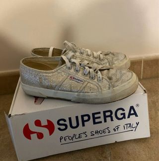 Zapatillas Superga, modelo clásico, en color dorado laminado. Número 36. Calzan completo; yo suelo calzar 37.Para pie fino sin calcetines o con calcetines fino, valdrían. - Suela de goma blanca. Estado-Muy bueno; muy poco uso. El precio es FIJO; NO respondo a ofertas. No acepto cambios ni devoluciones. Envíos a través de Wallapop y preferiblemente por Inpost.
