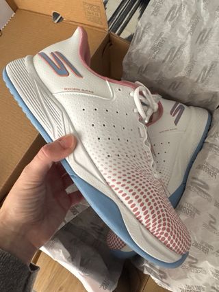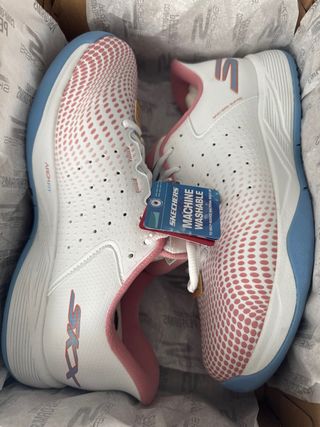 Zapatillas deportivas Skechers modelo VIPER COURT RELOAD en blanco con detalles en rosa y suela azul. - Diseño con perforaciones y patrón de puntos. - Tecnología Arch Fit para soporte. - Aptas para lavado a máquina. - Aptas para tenis o pádel.