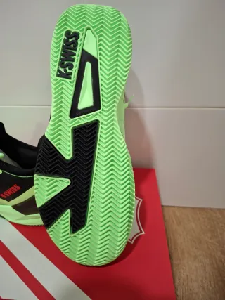 Zapatillas deportivas K-Swiss para hombre, diseñadas para tenis y pádel. Presentan una llamativa combinación de colores verde neón y negro. - Diseño moderno y deportivo. - Detalles en contraste.