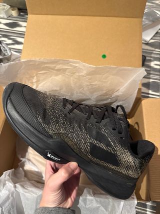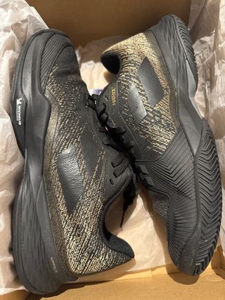 Zapatillas deportivas de tenis o pádel con un diseño moderno. - Combinación de colores negro y dorado. - Suela con tecnología Michelin. - Tejido con tecnología Matryx. - Entresuela KPRS-X. - Talla 43 - 27,5 cm