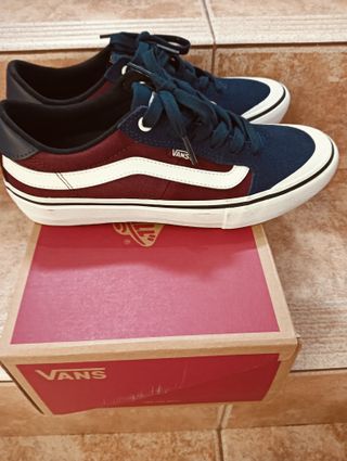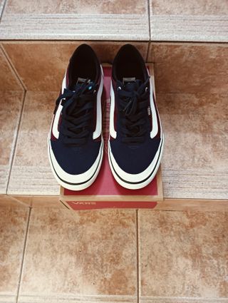 Zapatillas de la marca Vans con un diseño moderno. - Combinación de colores azul y rojo. - Cordones negros. - Suela blanca.