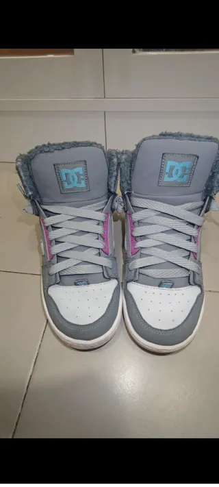 Zapatillas altas de la marca DC Shoes. - Diseño en color gris con detalles en rosa. - Forro interior de pelo sintético. - Logo de DC Shoes en la lengüeta. Son usados no devolución Buenos para los amantes d ellos tenis y para este invierno