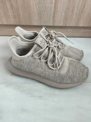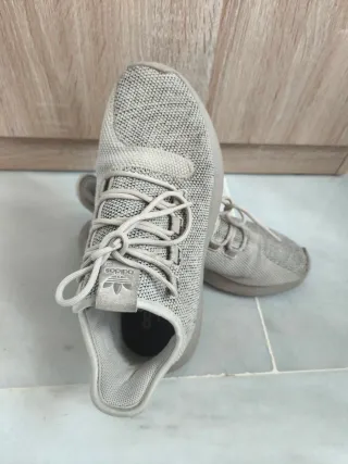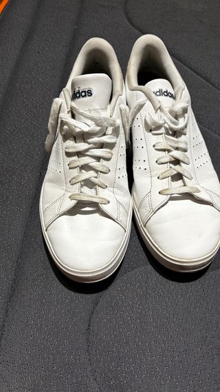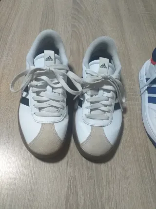 Se venden dos pares de tenis de la marca Adidas. - Un par de corte bajo. - Un par de corte alto. - Combinación de colores blanco y beige.