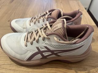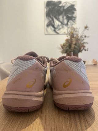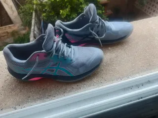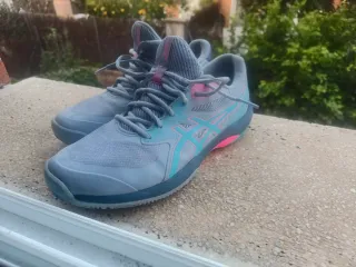 Zapatillas deportivas Asics de pádel o tenis. 5 partidos. - Diseño moderno en gris con detalles en turquesa y rosa. - Suela de goma para un buen agarre.