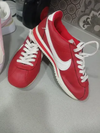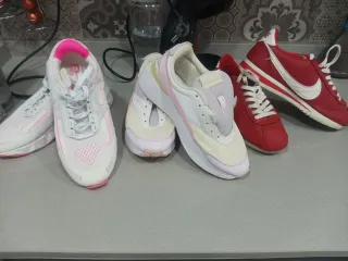 Lote de zapatillas deportivas. - Zapatillas blancas con detalles rosas. - Zapatillas rojas con detalles blancos.