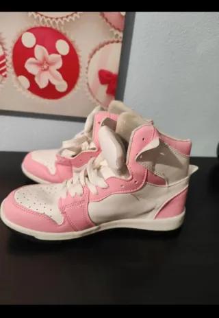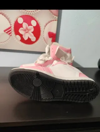 Zapatillas de caña alta con un diseño moderno y llamativo. - Combinación de colores rosa y blanco. - Estilo deportivo y casual.