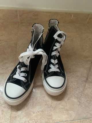 Tenis de lona estilo Converse, altos y con cordones. - Color negro con detalles blancos. - Cierre de cremallera lateral. - Suela de goma blanca.