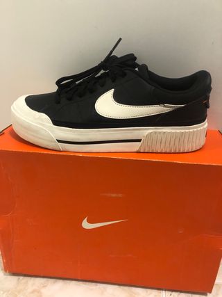 Zapatillas de plataforma Nike Court Legacy Lift para mujer de piel. Tienen 2 usos por que me regalaron la talla equivocada. - Diseño en color negro y blanco. - Talla 40.5. Costaron 85€, las vendo por solo 35€!!