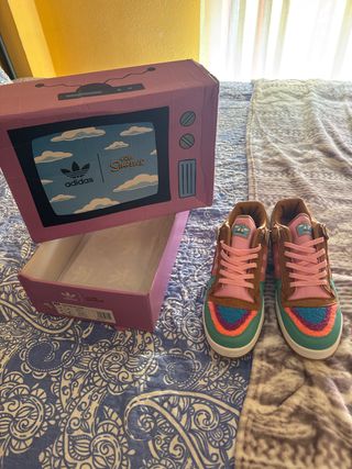 Tenis de edición especial inspirados en Los Simpsons. - Diseño llamativo con múltiples colores. - Detalles en rosa y verde azulado. - Incluye caja temática de televisión.