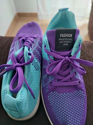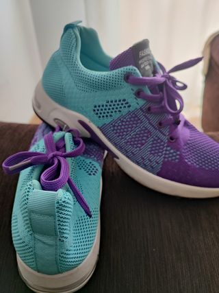 Zapatillas deportivas para mujer con un diseño moderno y llamativo. - Combinación de colores morado y turquesa. - Tejido transpirable. - Cierre con cordones. - Muy cómodas , con cámara de aire - Talla de largo 30cm
