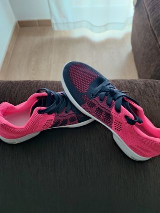 Tenis para baloncesto marca Tarmak de Decathlon en talla 36, en buen estado. Tenis negros talla 36 Artengo de Decatlón. - Zapatillas de caña alta en color salmón - Zapatillas de caña baja en negro y amarillo.