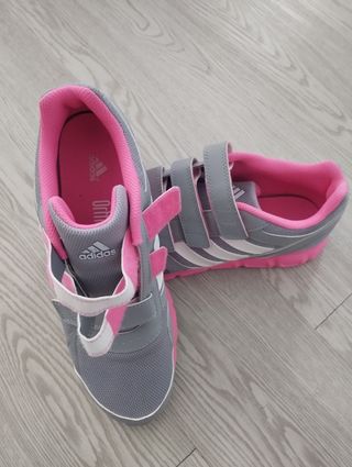 Zapatillas deportivas Adidas para mujer en tonos grises y rosas. - Cierre de velcro para un ajuste fácil. - Diseño con las tres rayas características de la marca. - Interior acolchado para mayor comodidad.