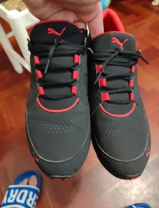 Zapatillas deportivas Puma en talla 42. - Diseño moderno en color negro con detalles en rojo. - Cierre con cordones. - Logo de Puma visible.