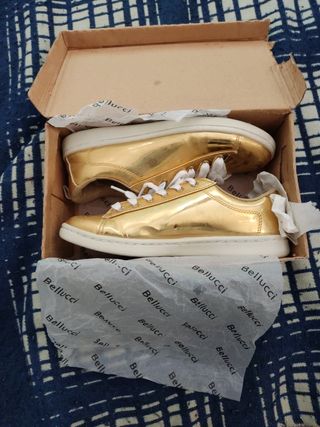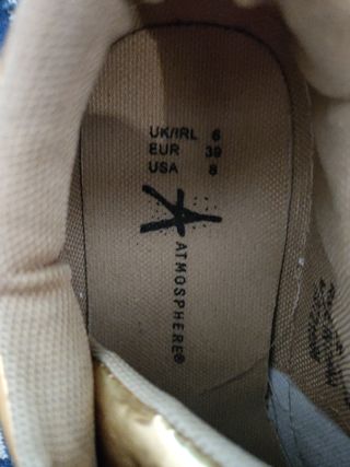 Zapatillas deportivas de color dorado como el oro de la marca Atmosphere. Un calzado llamativo y moderno. - Te ha encantarán. Son únicos. Nos hacen recordar a los zapatos de Dori,la Julia ven de la película: El Mago de OZ. Une los talones pide un deseo y se cumplirá lo que pidas. - Diseño brillante. - Cierre con cordones blancos. - Suela blanca antideslizante