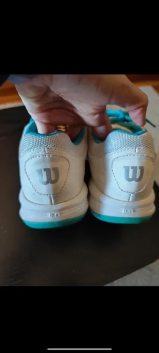 Zapatillas de tenis Wilson con un diseño moderno y cómodo. - Combinación de colores blanco y turquesa. - Cordones turquesa. - Suela de goma. Talla 38, talla justa. Usadas pero en perfecto estado.