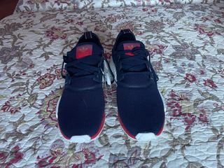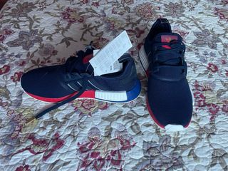 Tenis Adidas ndm r1 de tela listos para estrenar. - Diseño moderno en azul con detalles en rojo. - Cordones para un ajuste seguro. - Suela blanca. - Logo de Adidas en la lengüeta.