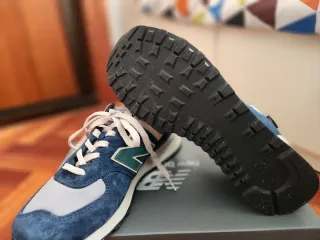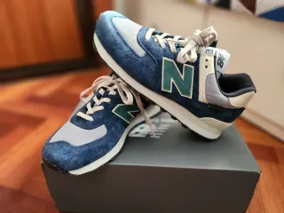 Zapatillas deportivas New Balance 574, talla 39, a estrenar. - Diseño moderno en tonos azules y grises. - Cordones de color claro. - Detalle de la 'N' en verde.