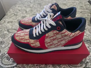 Tenis de la marca CH con un diseño distintivo. - Patrón de monograma en beige y rojo. - Detalles en azul marino. - Cordones blancos.