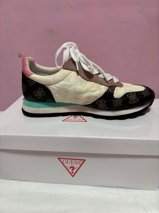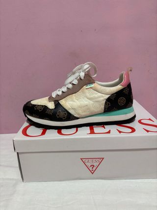 Bonitos tenis Guess con un diseño único. - Combinación de colores beige, marrón, rosa y turquesa. - Detalle de logo Guess repetido en la parte superior. - Suela blanca con detalles en negro y turquesa. - Pequeñas manchas visibles en la tela.